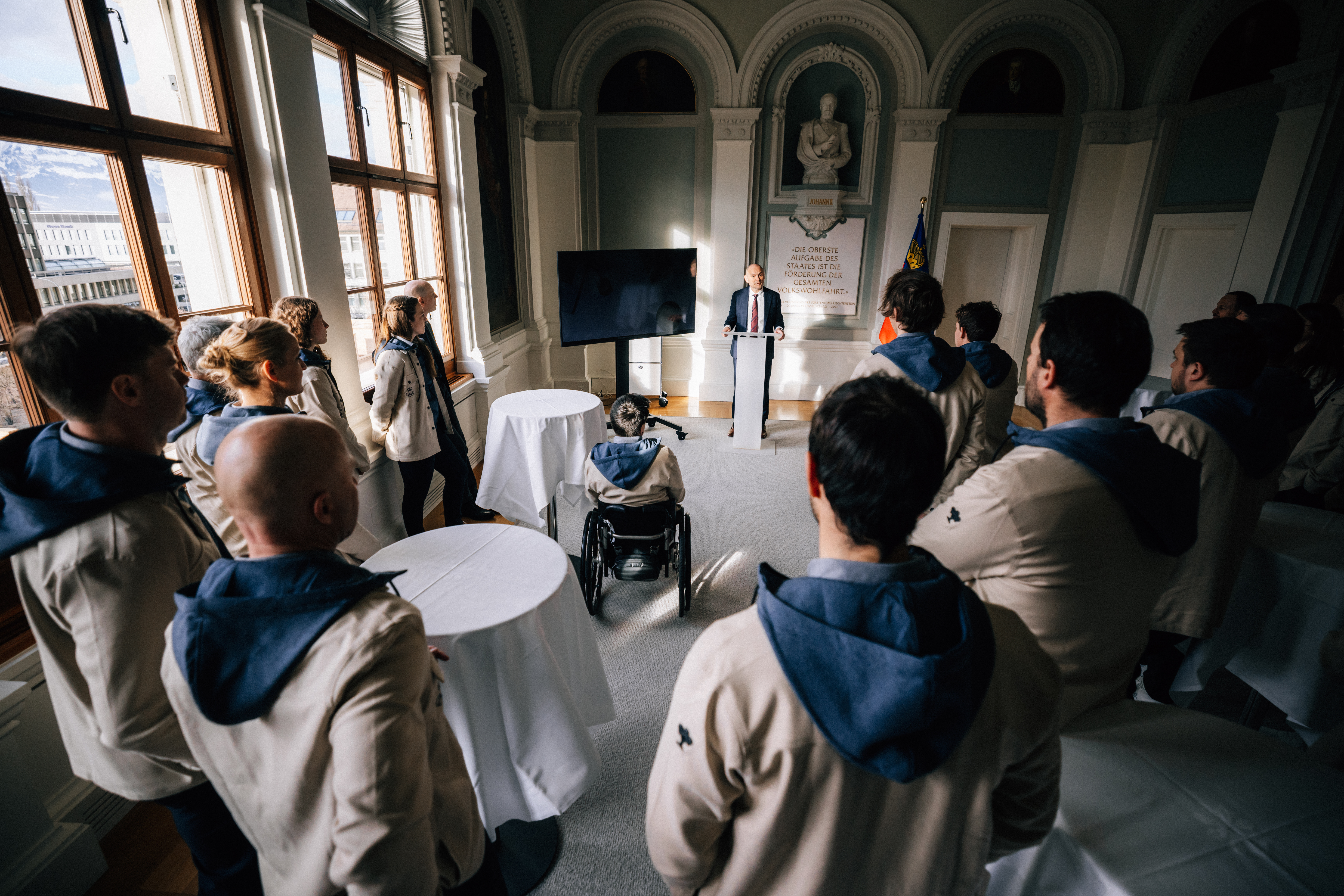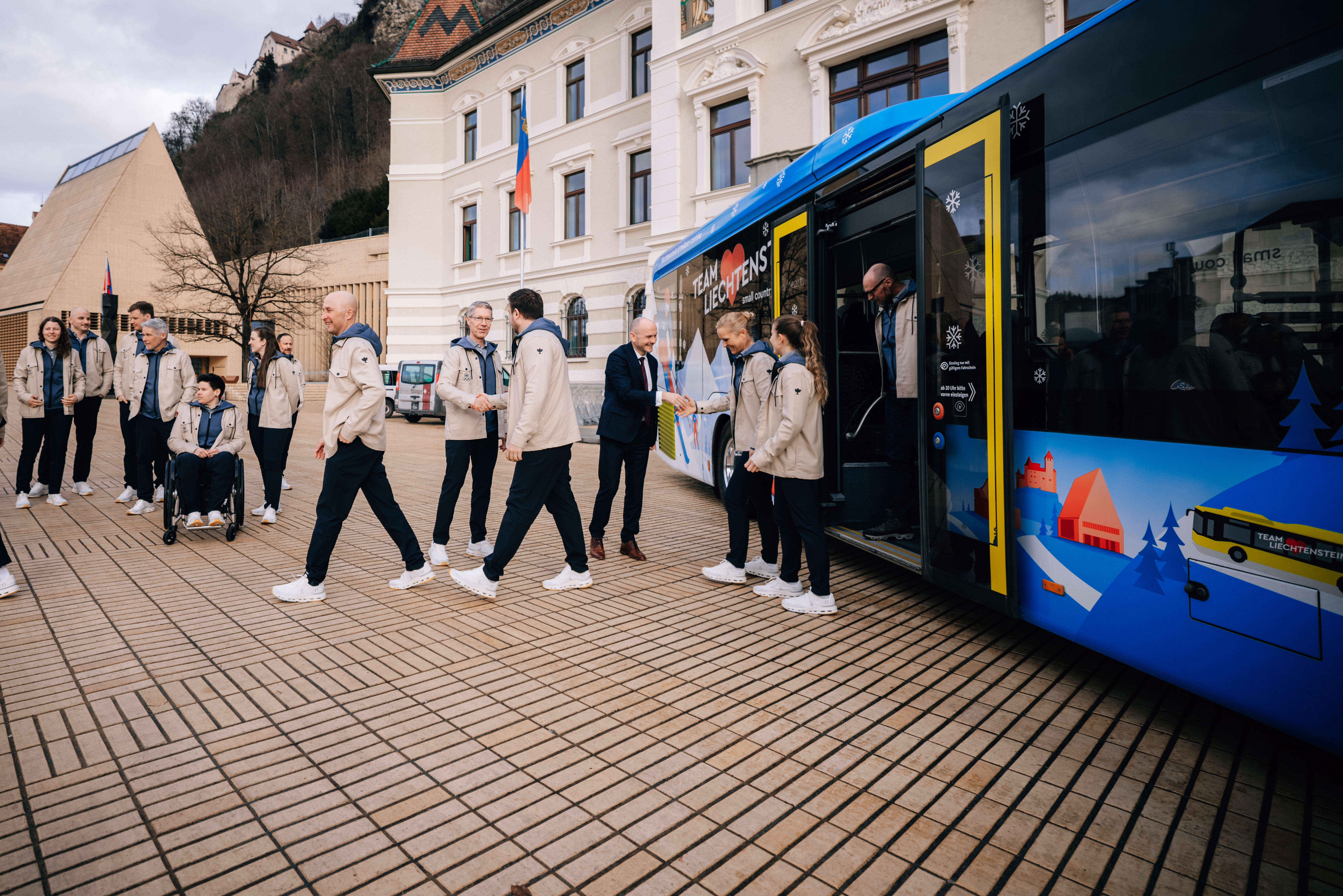 Die liechtensteinische Delegation fuhr im eigens für die Olympischen Spiele unter dem Motto «Team Liechtenstein: Small country. Big heart.» gestalteten Bus der LIEmobil vor, der auch an den Spielen in Milano-Cortina als mobiles «House of Liechtenstein» fungieren wird. Auf den Anlass im Regierungsgebäude folgte die offizielle Verabschiedung durch seine Durchlaut den Erbprinzen auf Schloss Vaduz.